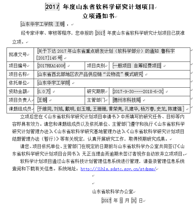 今日,山东省科学技术厅下发了《关于下达2017年山东省重点研发计划(软科学)部分的通知》(鲁教字[2017]145号),世俱杯sjb官网王钢老师的《山东省西北地区农产品供应链“云物流”模式研究》(项目编号2017RKA14006)获批立项,这也是世俱杯sjb官网2017年度获批的唯一一项软科学项目,同时也填补了世俱杯sjb官网山东省重点研发计划的空白。