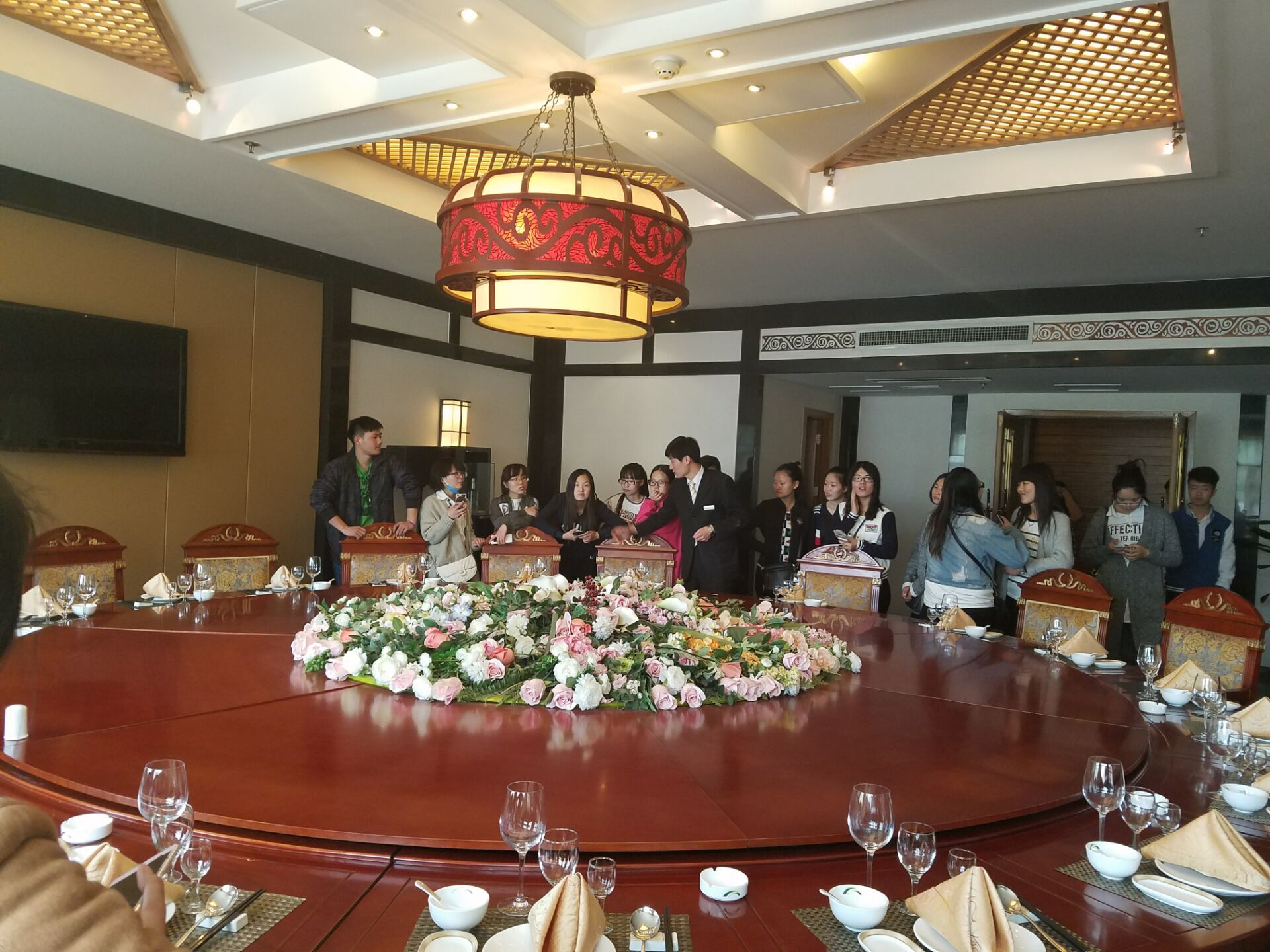 在参观商务中心、会议室时给同学们介绍了服务项目、会场布置等的细节和需要注意的事项。在餐饮部,参观了中、西餐厅、自助餐厅,以及该酒店的主题包间,并讲解了餐具的摆放、座次的安排、点菜、上菜、派菜、斟酒等专业知识,以及餐饮部工作人员的岗位职责和服务标准。