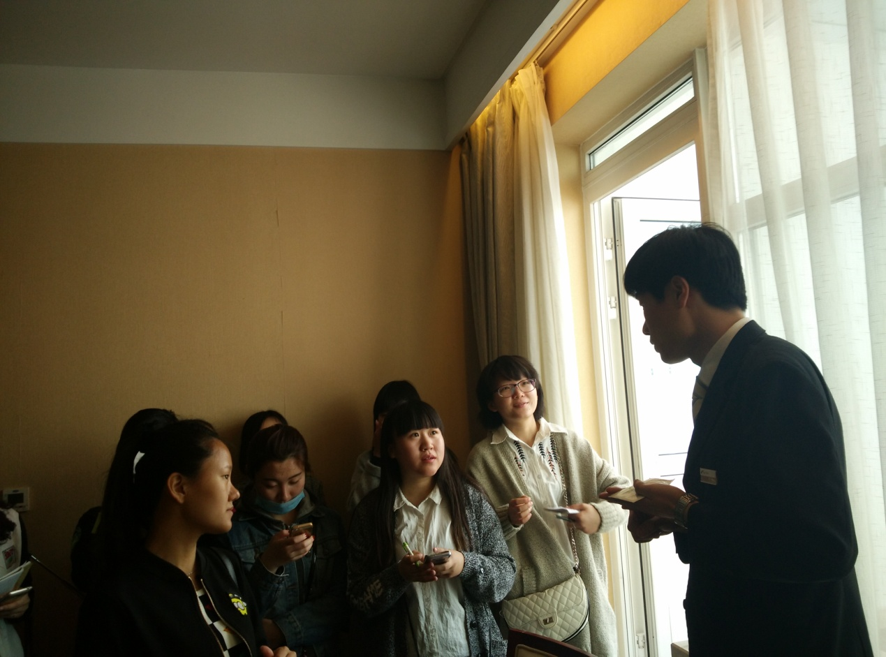 在客房部,为学生们介绍了客房部组织结构、岗位职责、服务流程,并参观了标准间和总统套房,进一步详细讲解了客房的设施设备、客房服务的要点等知识,使学生在观摩过程中更好的理解了书本的理论知识。在康乐部,带领学生们参观了健身房、游泳池、高尔夫球场等,使学生对于康乐服务的重要性有了进一步的认识。