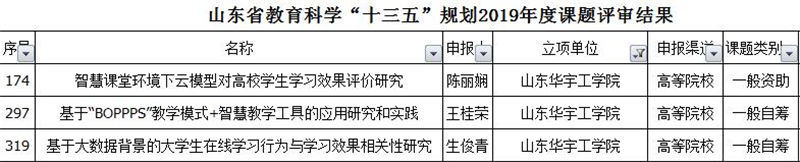 在本次获批立项的3项山东省教育教学项目中,陈丽娴老师主持的课题《智慧课堂环境下云模型对高校学生学习效果评价研究》为资助项目、王桂荣老师主持的《基于“BOPPPS”教学模式+智慧教学工具的应用研究和实践》与生俊青老师主持的《基于大数据背景的大学生在线学习行为与学习效果相关性研究》为自筹项目。