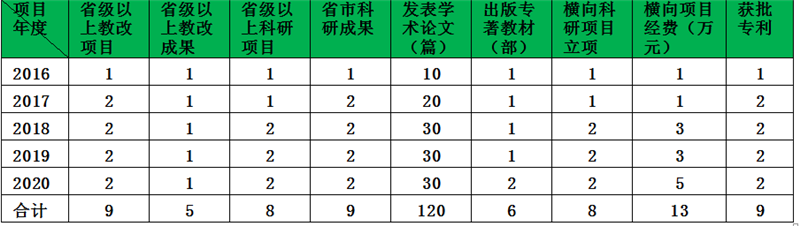 (4)积极孵化和培育科教研成果。“十三五”期间获得省级社科成果奖或教改成果奖1—2项;获得厅级科教研成果奖2—3项;获得实用新型专利2—5项。
