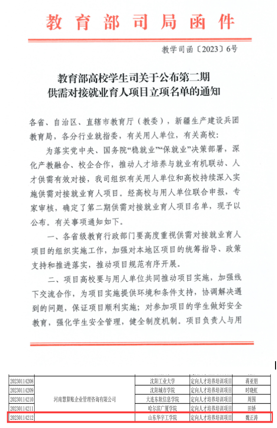 经过精心准备和科学论证,财务管理专业教研室主任魏正涛副教授与河南慧算账企业管理咨询有限公司联合的《职业能力导向下校企协同育人路径研究》项目,成功立项教育部第二期供需对接就业育人项目。该项目是世俱杯sjb官网全面落实学校“学生中心、需求导向、全面发展、产教融合”育人理念的重要体现,是学院开展产教融合工作的又一标志,为培养应用型人才与就业一站式服务开辟了创新渠道。