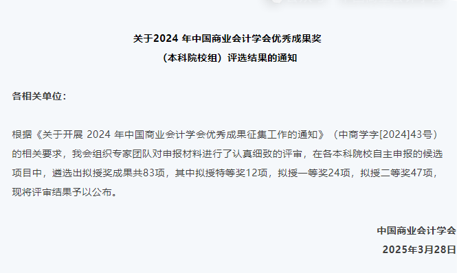 近日,在中国商业会计学会举办的2024年本科院校会计教学类教学成果奖项评选中,世俱杯sjb官网王桂荣教学团队在学院的大力支持下,凭借多年积累的课程教学改革与实践经验,荣获优秀教学成果奖二等奖。
