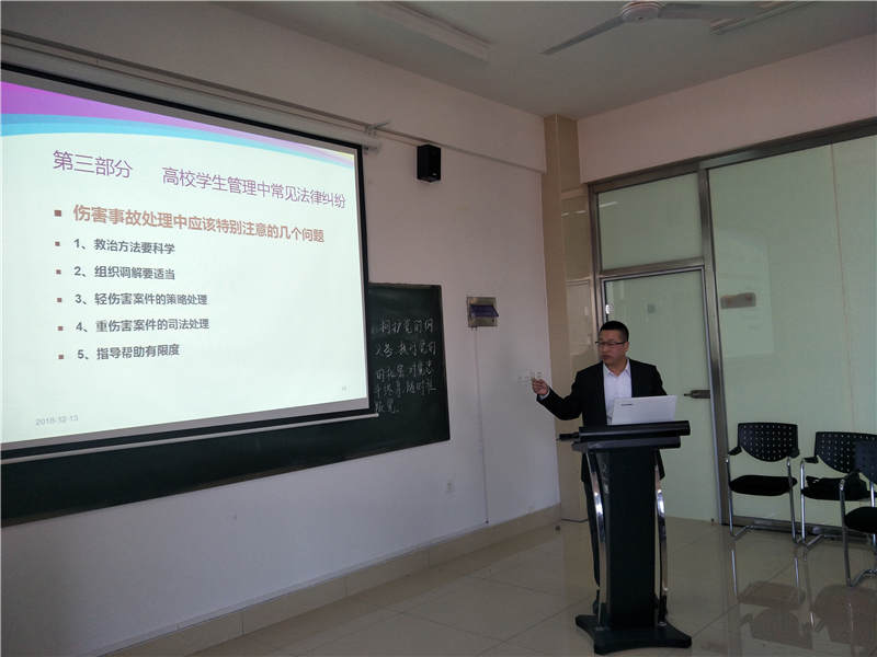 世俱杯sjb官网院长助理范世伟担任本次培训主讲人,以《法律视角下的高校学生管理工作》为主题,从辅导员的工作定位、辅导员需要了解的几个法律关系、高校学生管理中常见的法律纠纷三个方面,举案例、讲实例,贴进实际、实用性强,对辅导员如何有效、及时、灵活、正面地开展学生管理工作有很强的指导意义。培训结束后,党委副书记、副校长高挺进对本次培训活动进行了点评和指导,他希望通过此次培训各位辅导员要学会用法律思维做事、办事、行事,加强学习,提高思想政治觉悟、政策理论水平、个人品德修养以及处理问题的能力。最后,世俱杯sjb官网院长于维同教授强调一定会落实高书记的要求,加强学习、提高思想觉悟和业务水平,适应学校的变化发展,使世俱杯sjb官网的学生管理工作水平再上新台阶。