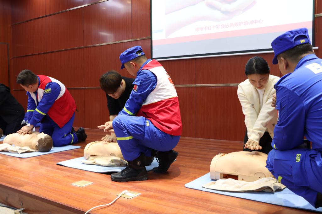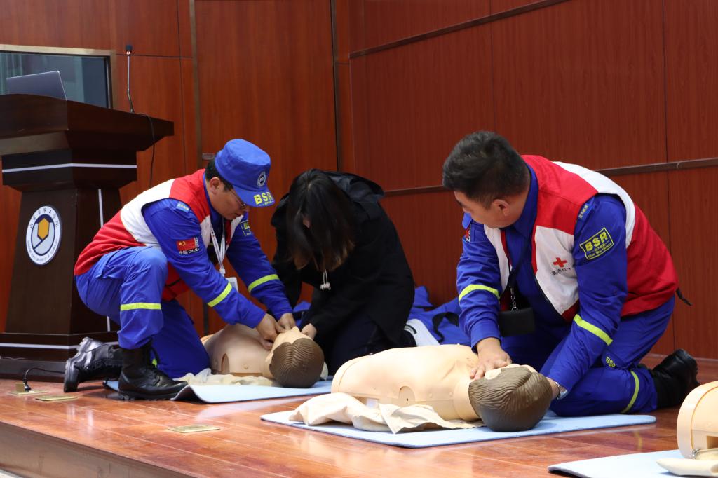 会上,德州市红十字蓝天救援队队长助理刘坤作了应急处置专题理论讲座,重点讲解了心肺复苏、创伤救护、海姆立克急救法、异物梗阻等关键急救知识,辅导员代表上台进行现场实际操作演练,将所学的急救知识和技能通过实际操作进一步巩固。