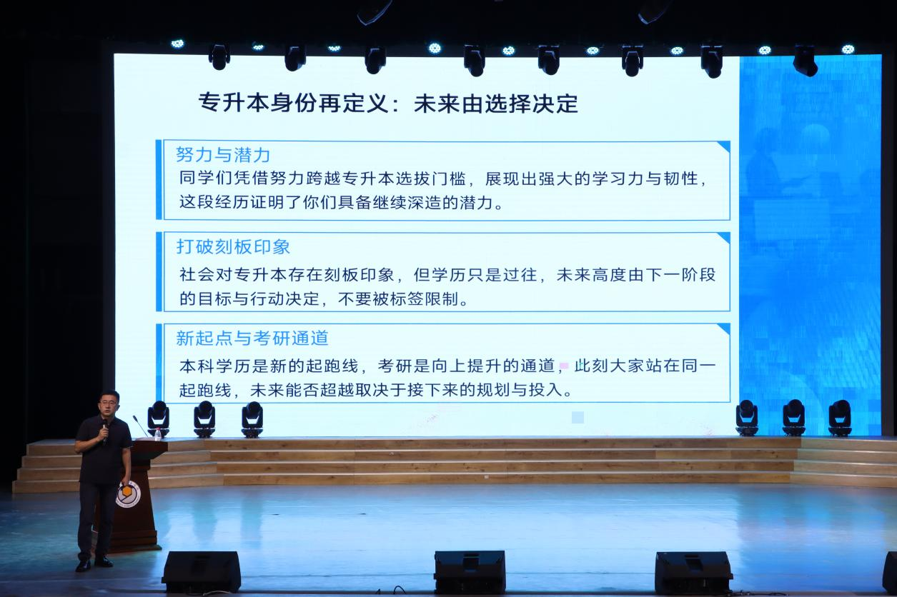 孙建老师拥有21年高校教育管理与学生指导经验,屡获殊荣,并指导学生在多项大赛中取得佳绩。他以个人工作经历为引,通过真实案例,构建了“认知—规划—行动”的指导框架,强调“专升本”是考研逆袭的新起点,并结合科研数据解析考研趋势与必要性。在实战指导环节,孙老师从目标定位、时间管理、资源利用三方面展开,建议学生科学选择院校、合理规划备考阶段,并善用学校资源与同伴互助。他鼓励新生“砥砺奋进,方能行远”,以坚定行动实现学历跨越。