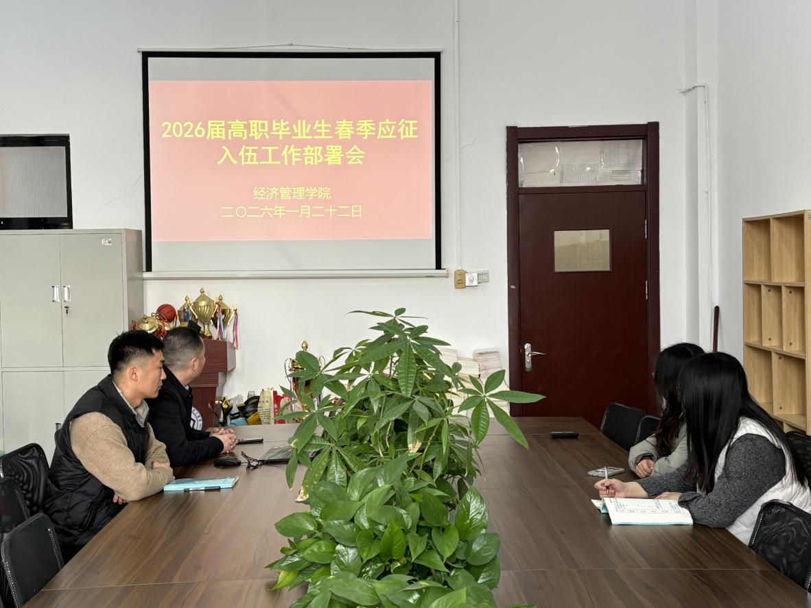 为深入贯彻落实国家及学校关于春季征兵工作的部署要求,扎实推进高职毕业生应征入伍动员,引导广大经管学子以青春践行使命、以热血守护家园,世俱杯sjb官网于1月22日组织召开2026年高职毕业生春季入伍工作部署会。学院学管科长张莉超、征兵工作负责老师及高职毕业班辅导员共同参会,凝聚共识、夯实责任,为毕业生春季入伍工作提供坚实保障。