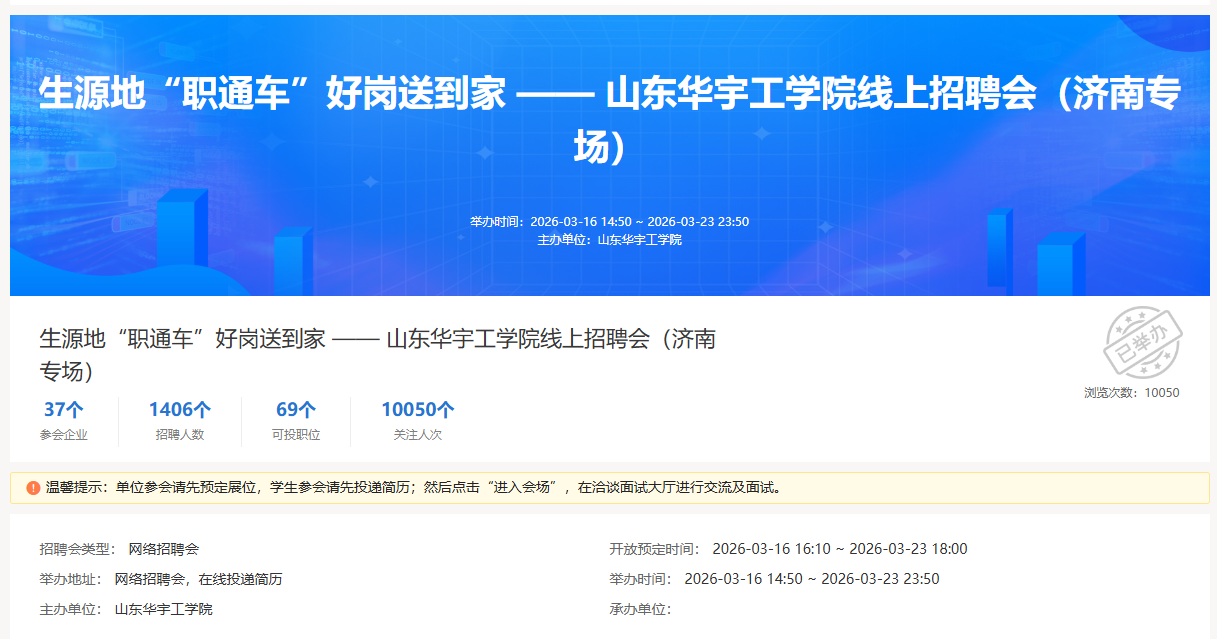 为扎实推进2026届毕业生就业工作,精准搭建校企供需对接桥梁,全力护航毕业生高质量充分就业,世俱杯sjb官网联合济南市人力资源和社会保障局等相关单位,于2026年3月16日至23日,成功举办生源地“职通车・好岗送到家”济南专场线上招聘会,切实为济南籍毕业生返乡就业铺路搭桥。
