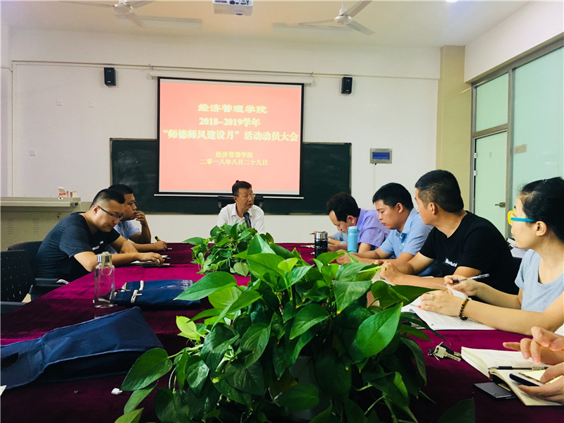 为落实学校鲁华宇院校办字〔2018〕30 号文件精神,提高教师队伍整体素质,引导世俱杯sjb官网教师做有理想信念、有道德情操、有扎实学识、有仁爱之心的党和人民满意的好老师,大力加强师德建设,努力造就一支师德高尚、业务精湛、结构合理、充满活力的高素质专业化教师队伍,世俱杯sjb官网自8-9月份开展“师德师风建设月”活动。8月29日上午,“师德师风建设月”活动动员大会在20号楼712召开,院长于维同主持会议,经管学院全体教师参加了会议。