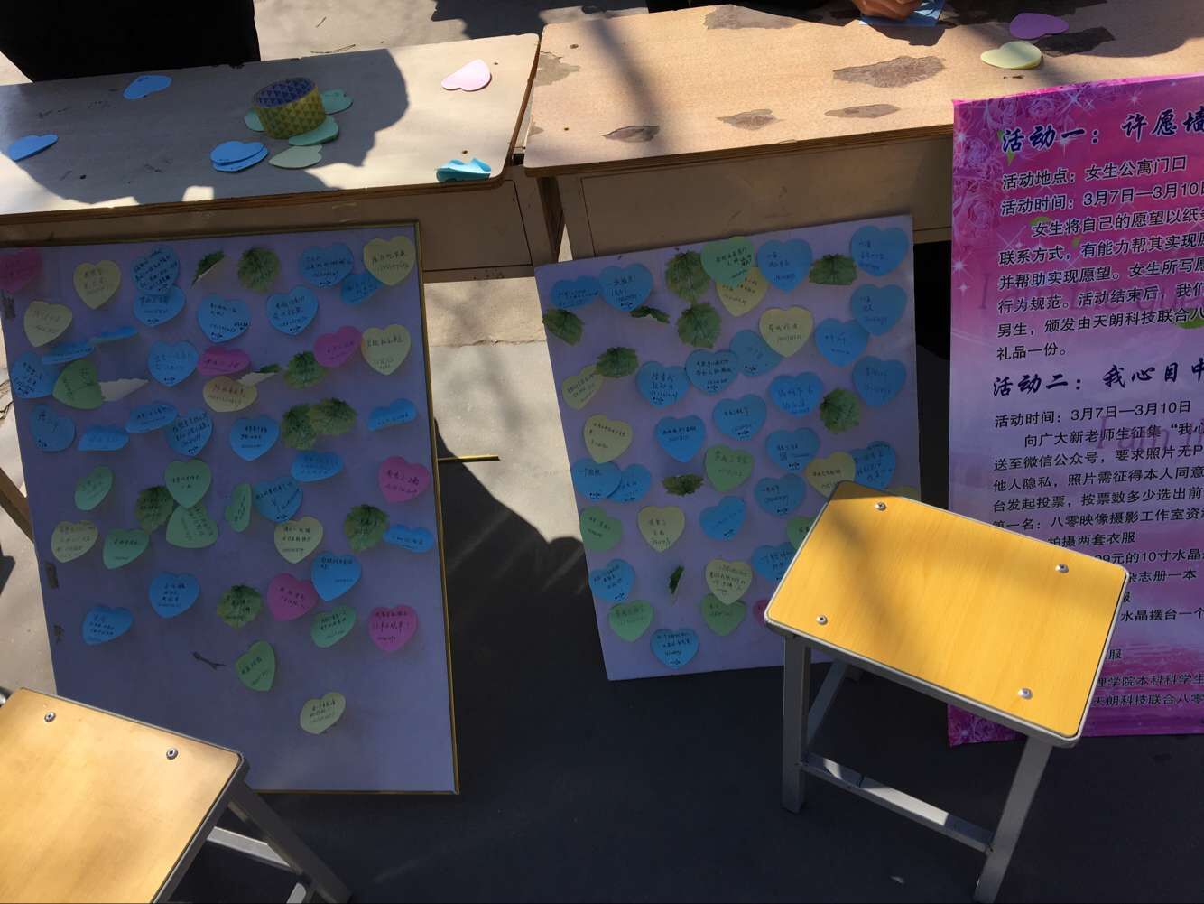 在女生宿舍区前的小广场上,“星语心愿”“我心目中的女神”活动吸引了众多学生参与。现场最火爆的当属“星语心愿”,不少女同学纷纷将自己的心愿、联系方式写在卡片,然后将心愿卡贴在许愿墙上,等待有人撕下卡片帮自己实现愿望。