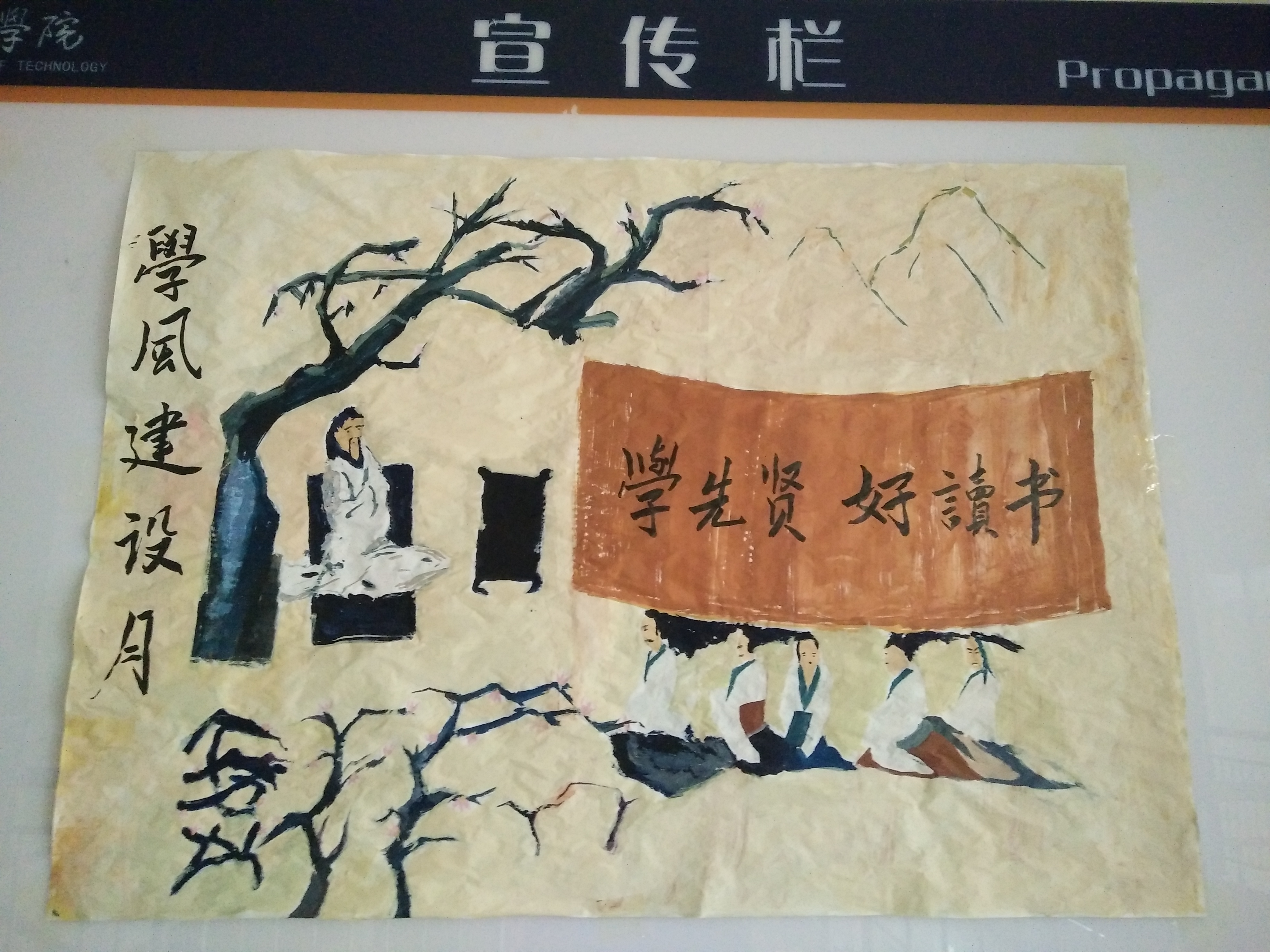 为宣传贯彻好“学先贤,好读书”活动,世俱杯sjb官网积极发挥宣传栏及班级板报的宣传作用。通过张贴宣传海报,绘制黑板报宣传“学先贤,好读书”活动。同时,各年级辅导员先后两次召开“好读书”主题班会宣传“学先贤,好读书”活动,学院二级网站也积极宣传本次活动,对本次活动进行全方位、多层次、多角度的宣传动员。