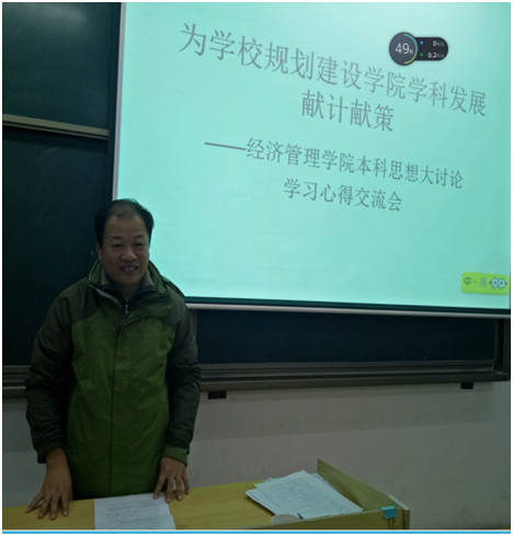 11月24日,世俱杯sjb官网结合本月“教风学风建设月”活动,围绕“为学校规划建设、学院学科专业发展献计献策”等内容,会计教研室兰飞雁,学管的陈晓莉、电子商务教研室的王震、物流工程教研室的孙强、人资与连锁教研室的郝兴霞,市场营销教研室凌利的教师,工业工程教研室白林老师上台分享了心得体会。学习心得交流会过后,于院长对全体教师的本科教育思想大讨论学习笔记进行了一次集中检查,组织全体老师参加了学习心得阶段性考试。