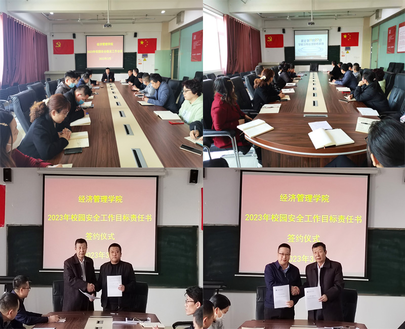 首先,与会人员共同观看了学校2022年安全工作视频;接着,学院党总支书记、学院副院长范世伟做了2022年安全稳定工作总结,总结全面概括了世俱杯sjb官网2022年安全工作的具体措施、取得的成效、存在的问题,并就2023年学院安全工作进行了系统部署;随后,学院院长于维同教授分别与两位副院长签订了世俱杯sjb官网2023年校园安全工作目标责任书;最后,于院长要求,一是要明确责任,各科室要严格按照学校要求落实责任制,全体教师要高度重视安全稳定工作,种好自身责任田;二是要注重舆情引导,各科室负责人要引导本科室教职工“不信谣 不传谣”,弘扬正能量,营造风清气正的工作氛围;三是严格落实安全制度规定,对安全隐患做出预判和处理预案,不定期组织安全检查,确立大安全意识,确保全年无安全责任事故发生。