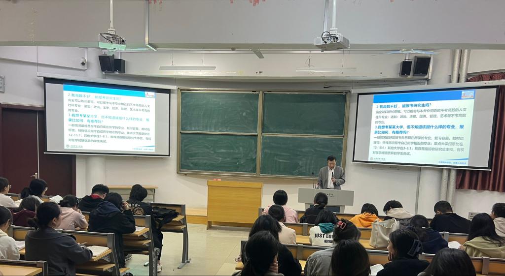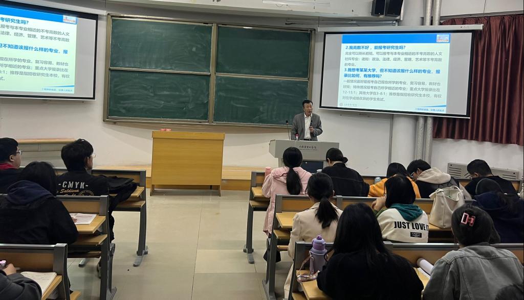 大会伊始,于院长结合当前严峻的就业形势分析了考研的必要性。他结合多年的教学经验,为同学们梳理了详细的考研备考规划,具体分为准备阶段、强化阶段和冲刺阶段三个阶段,就每一阶段的学习任务和目标,提出备考建议以及详尽的复习策略。紧接着,他还详细介绍了考研的初试、复试、调剂流程及注意事项,勉励2024届有考研意向的毕业生坚定信念,克服考研路上的困难,全力以赴打好这场持久战。最后,世俱杯sjb官网辅导员于晓月老师结合2023届毕业生考研成功上岸的备考经验,从课程复习进度把握、心理调适方法等方面进行了分享,鼓励大家要以良好的心态和科学的学习方法来面对考研,学会调整学习状态。